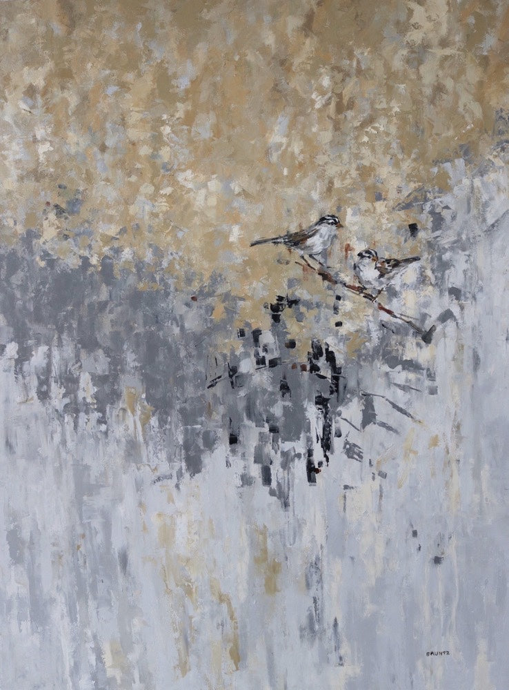 Abstracted Nature. White Crown Sparrows on a gold and gray background. Original oil painting. 40” x 30” x 1.5” on cradled birch panel. Edges are natural. Now available a The District Gallery in Knoxville, TN (865)200-4452
