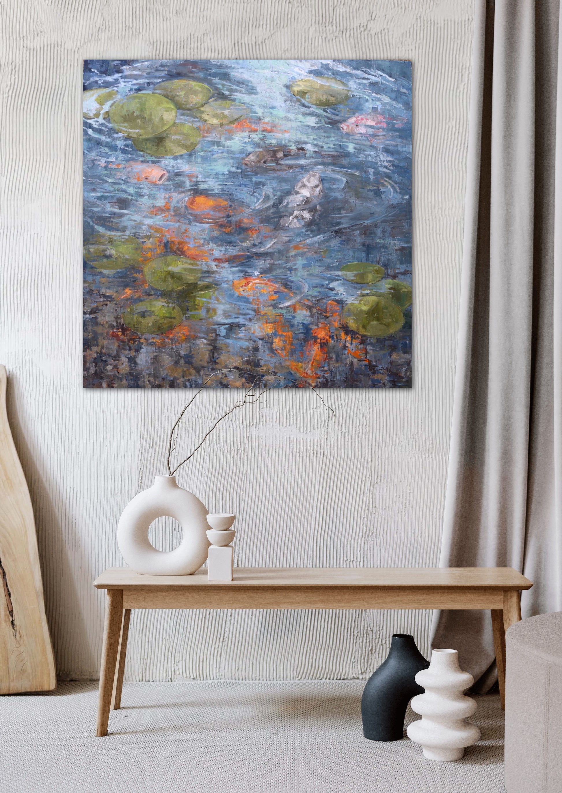 36" x 36" x 1 5/8" oil on cradled birch panel. Gorgeous fluid brushwork and texture. Truly a statement piece for any room. Ready to hang Looks great with raw wood edges. Would also look fantastic in a floater frame. Large contemporary of a koi pond