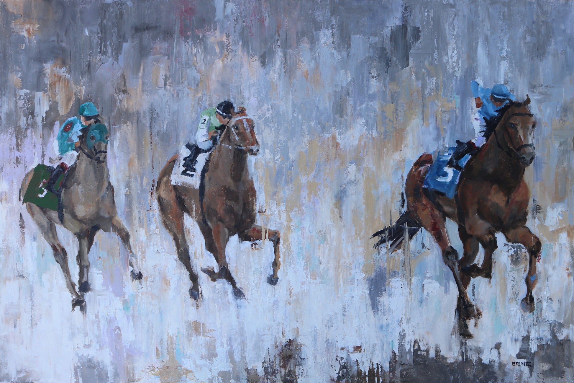 Original oil painting of thoroughbred horses in action at the track. This painting is available through The District Gallery in Knoxville, TN