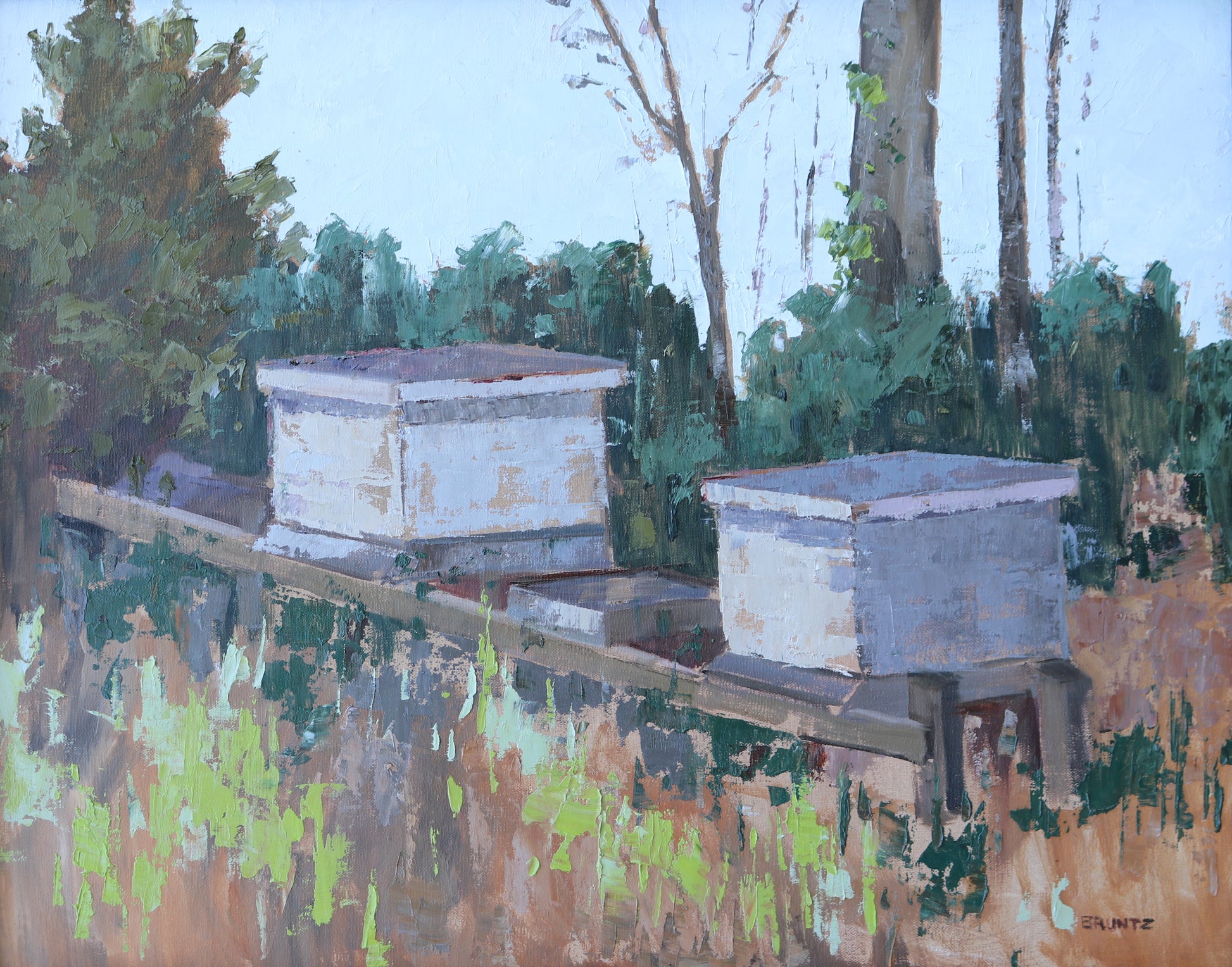 Original Oil painting of bee Hives. Painted at the 25th First Brush of Spring 2024. 16" x 20". Awarded third place.